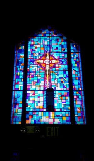 Six open-beam arches meet above me as hands folded in prayer. Brick walls have encased in them the stained windows representing church heritage and symbols of my my Christian faith.