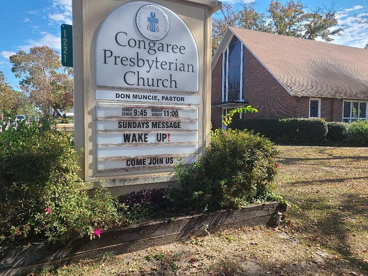 She was napping. The hefty lunch of ribs put her into a comfortable food coma. Sitting in my Jeep, thinking about what to do next, I thumbed through her book and carefully read the essay about her church titled My Church. The church named in the essay is Congaree Presbyterian Church, and it was a mere three miles from Jenni-Lynn. (Cue the Mission Impossible theme music.)